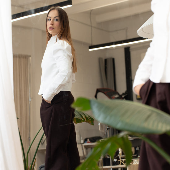 A white blouse slightly oversized with delicate puff shoulders and a classic button-down design. Effortlessly chic for work, weekends, or evenings out. Crafted from a blend of cotton and Tencel, this piece is durable, breathable, and strong — making it the perfect choice for any occasion.